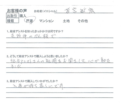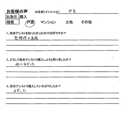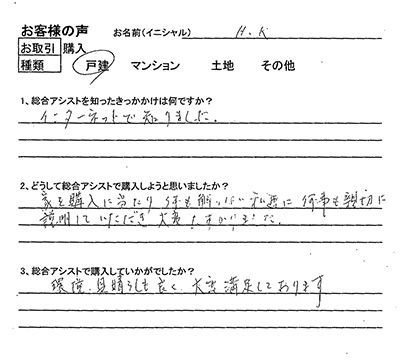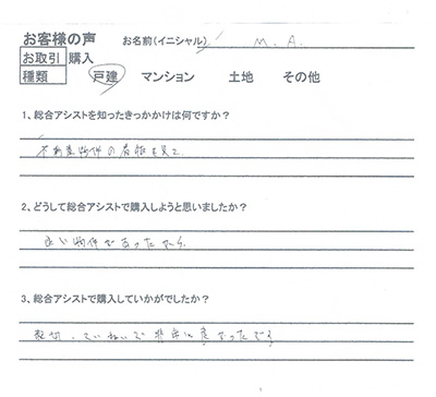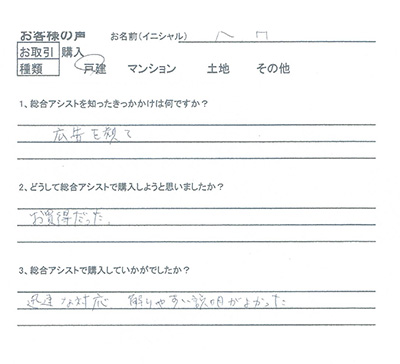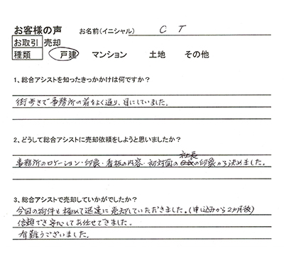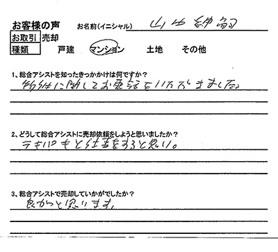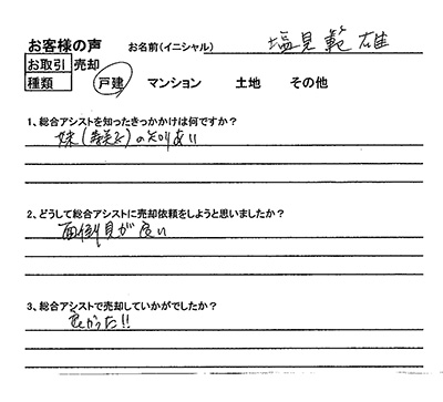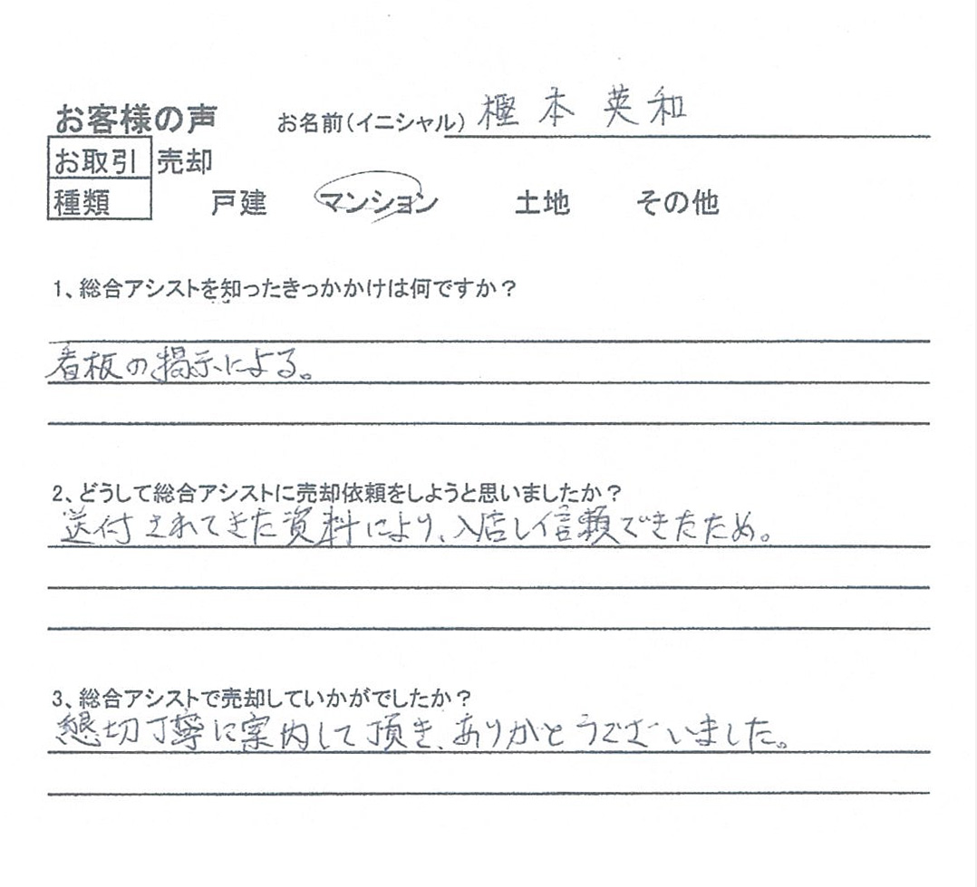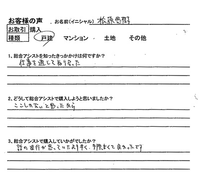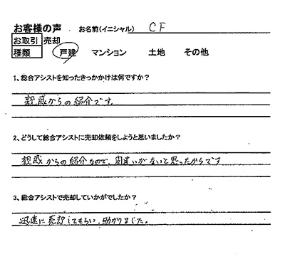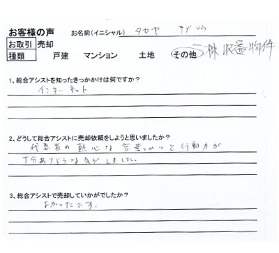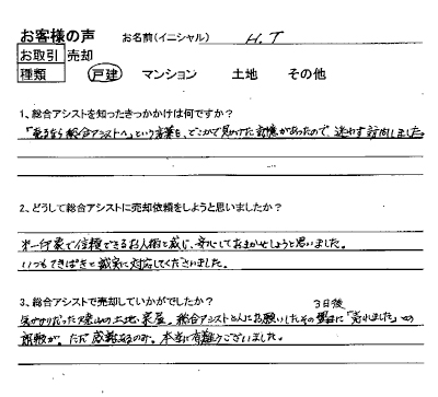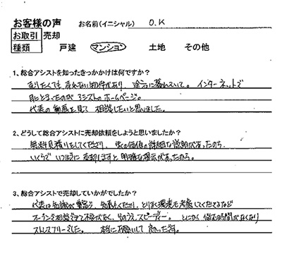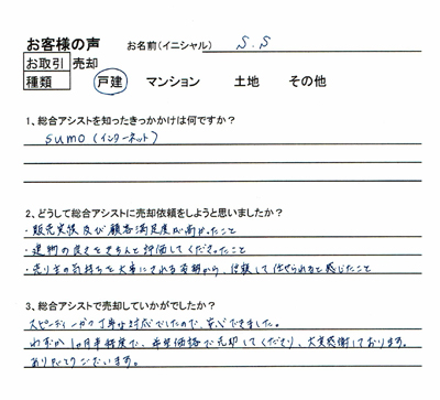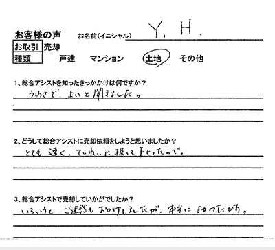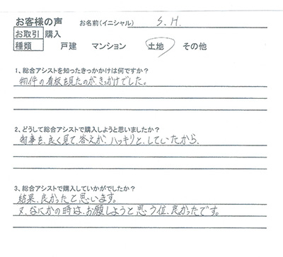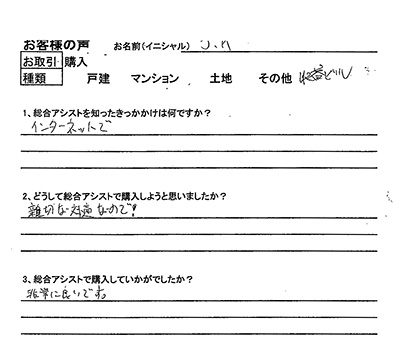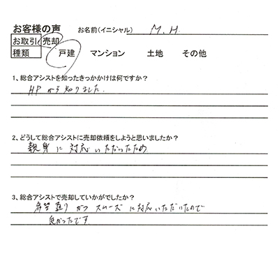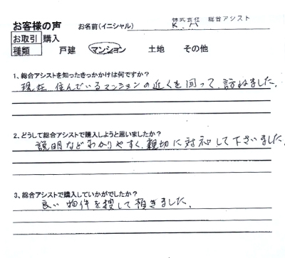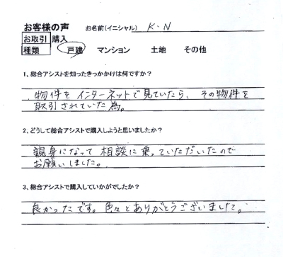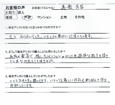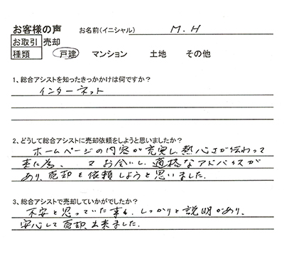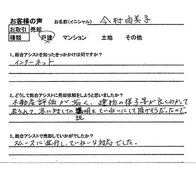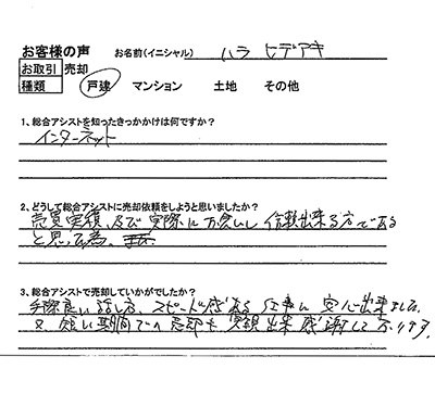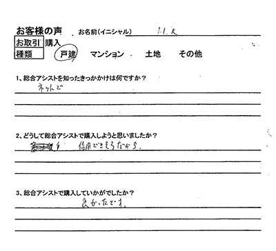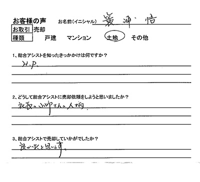 広島県呉市で不動産売買を行っている「株式会社総合アシスト」は、創業以来、地域の皆様から厚い信頼をいただき、呉市でもトップクラスの実績を積み重ねてまいりました。こちらでは、当社を通じて不動産を売却あるいは購入されたお客様の声の一部をご紹介します。一戸建てやマンション、土地、収益物件など、様々な物件の売買実績がございますので参考ください。